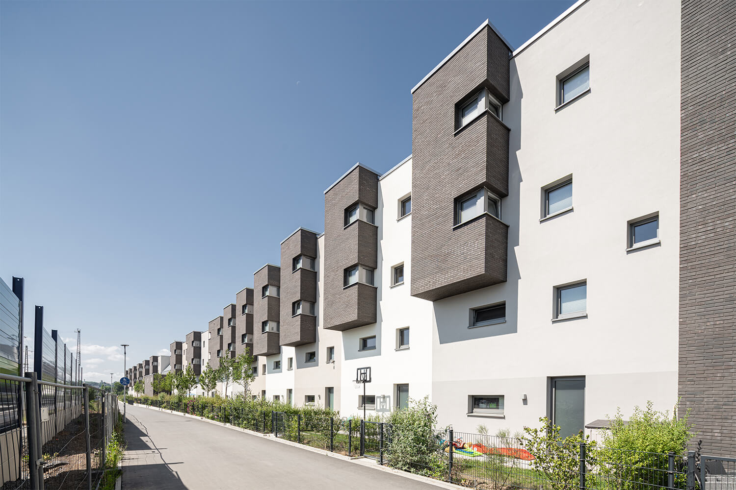 The housing precinct „Quellenpark“ has successfully managed these obstacles. A 300-meter-long building complex has been built parallel to the railway track in a distance of just 14m. Thanks to an elastic decoupling of the building’s strip foundations this development is being protected against ground-borne vibration and secondary air-borne sound.