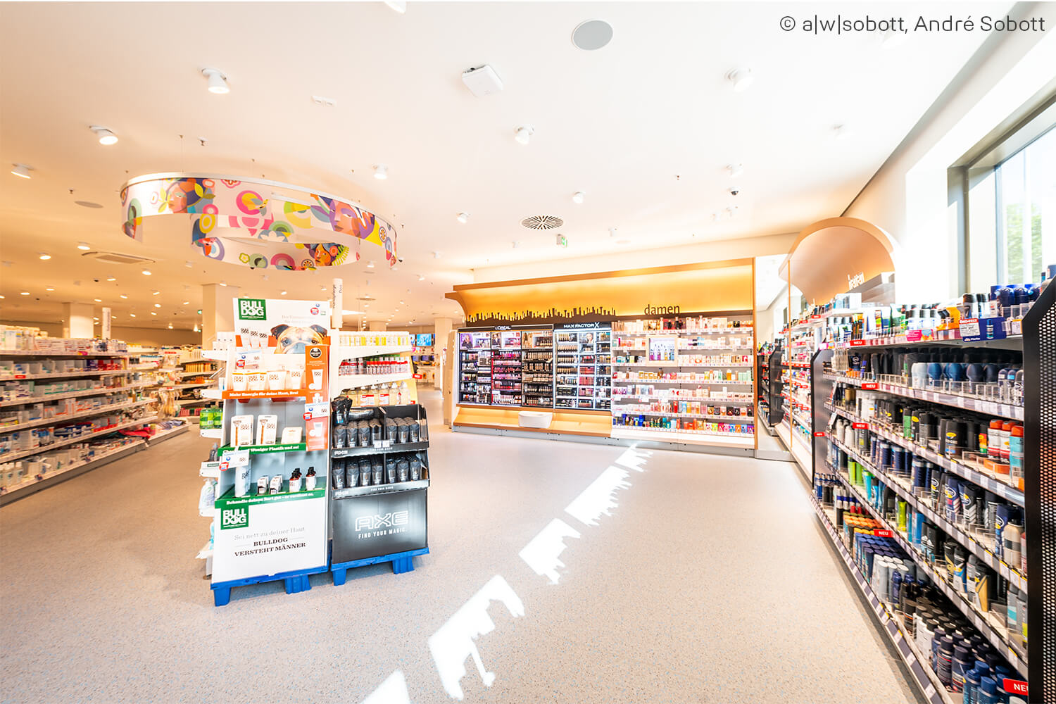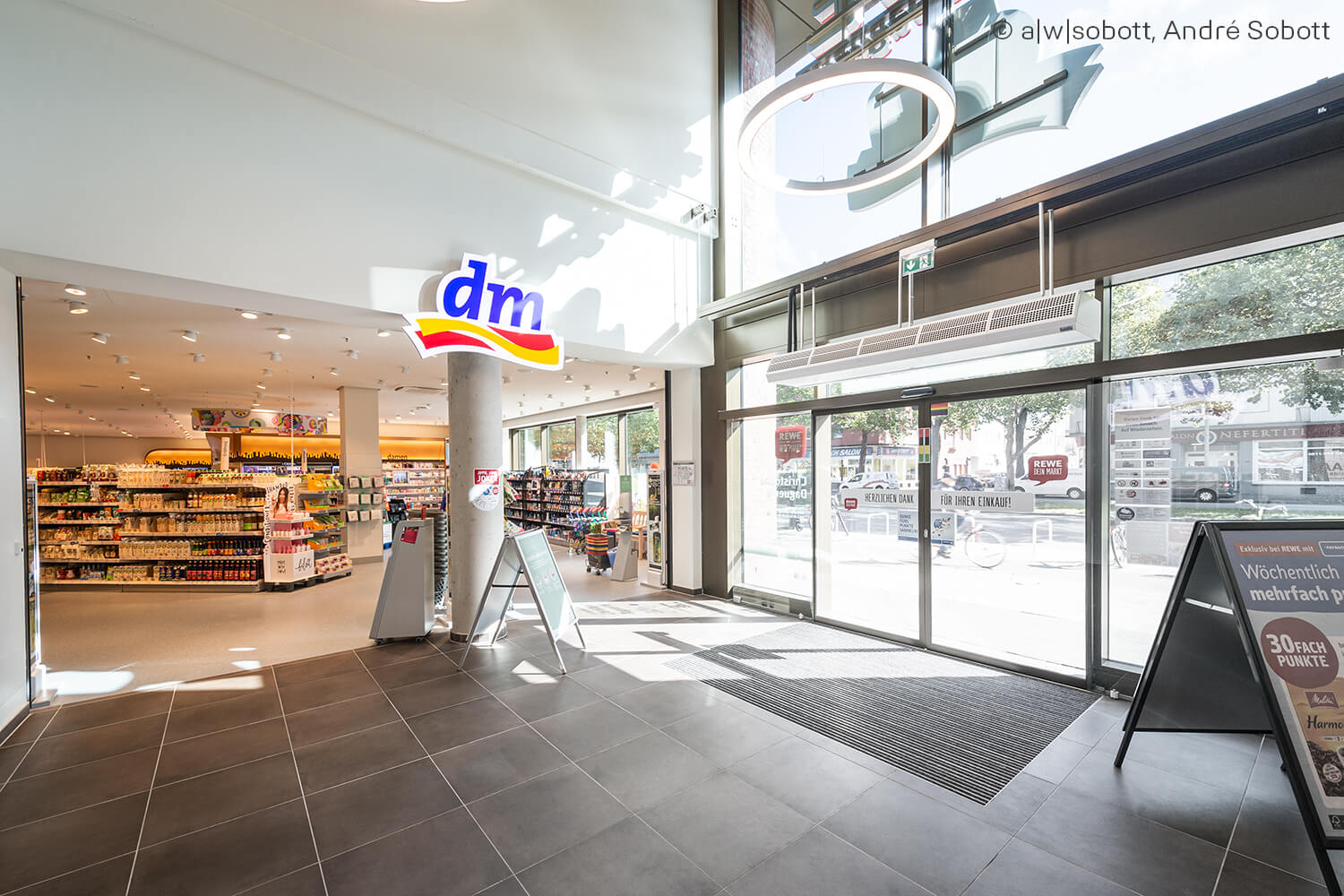 Ważną częścią skutecznych środków izolacji akustycznej było elastyczne oddzielenie ciężkich podłóg obu sklepów. W tym celu na powierzchni 1 900 m² ułożono matę izolacyjną REGUPOL sound 47, aby hałas strukturalny z tych poziomów nie rozprzestrzeniał się na wrażliwe piętra powyżej. Ważnym było również spełnienie wysokich wymagań dotyczących izolacji akustycznej.