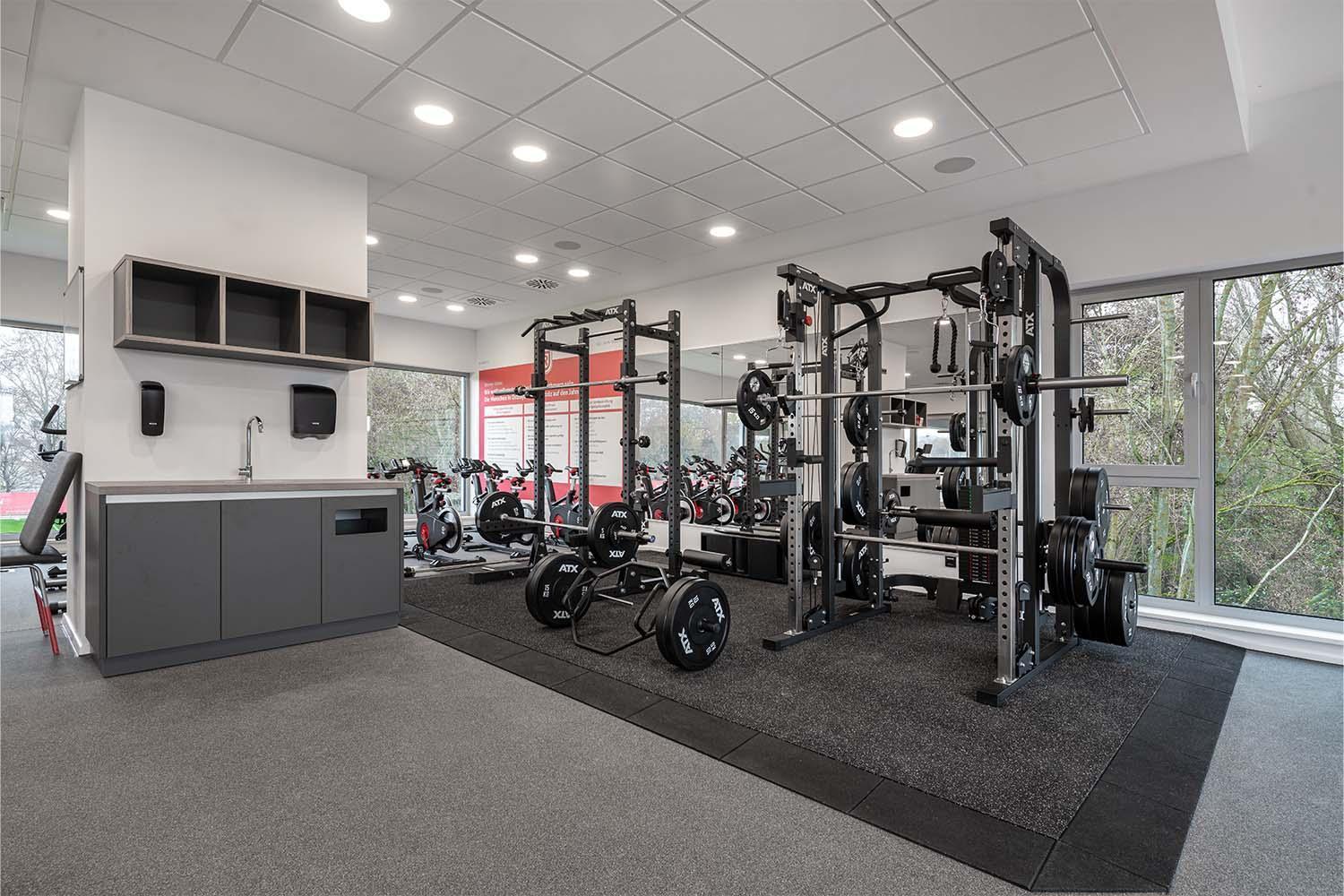 The integration of gyms in mixed-use buildings provides short distances as well as modern infrastructure but also requires effective sound control solutions. With the newly constructed functional building of football club SSV Jahn Regensburg, the goal was to combine offices and physiotherapy rooms downstairs and a gym upstairs on the second floor. Another highlight is the press room right next to the fitness area with its glass front and view over the entire football pitch. The architectural design shows that there are sensitive areas adjacent to the planned gym which required a specific concept of noise isolation and thus, the challenge was clear: An excellent sound control solution without any compromises to the sports related properties of the flooring was needed. Fitness and Acoustics – the link of two core strengths of REGUPOL.